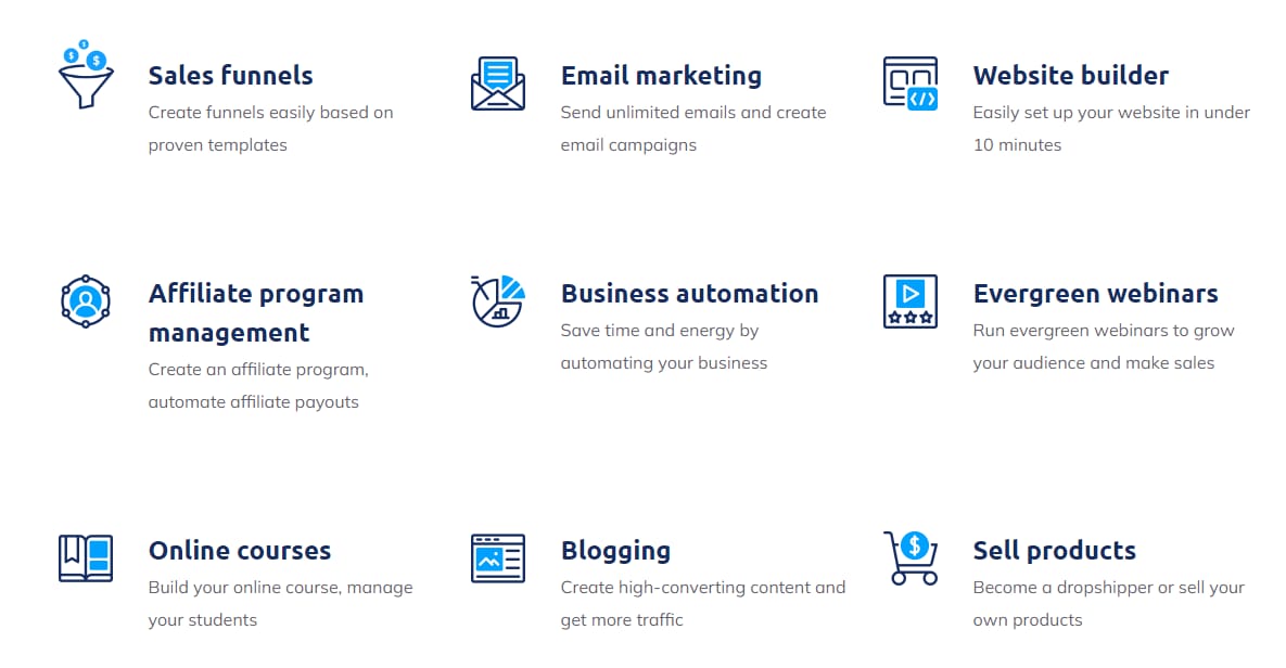 All-in-one Platform: It offers a comprehensive suite of features which includes sales funnel, email marketing, website builder, affiliate program management, business automation, and online course creation. It allows you to run your entire online business from a single platform.
